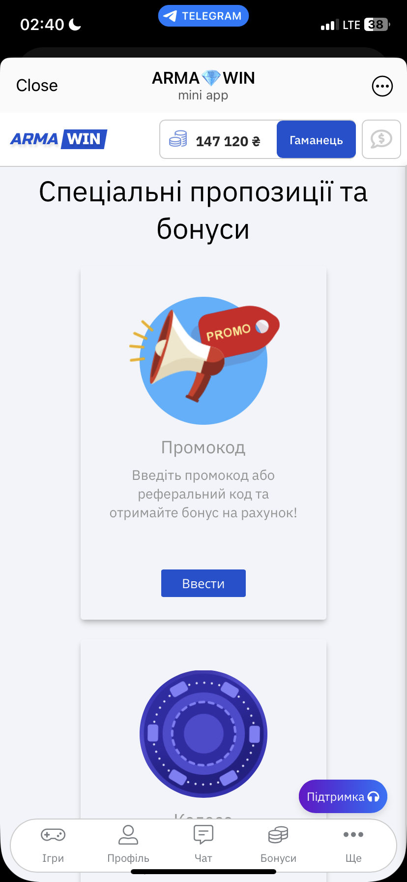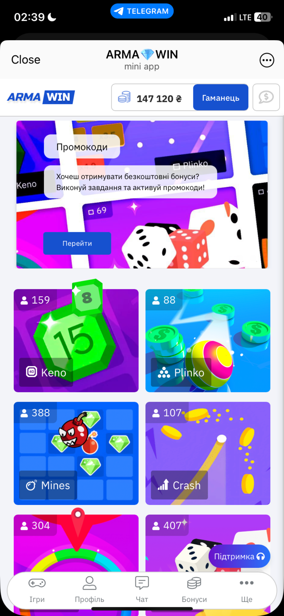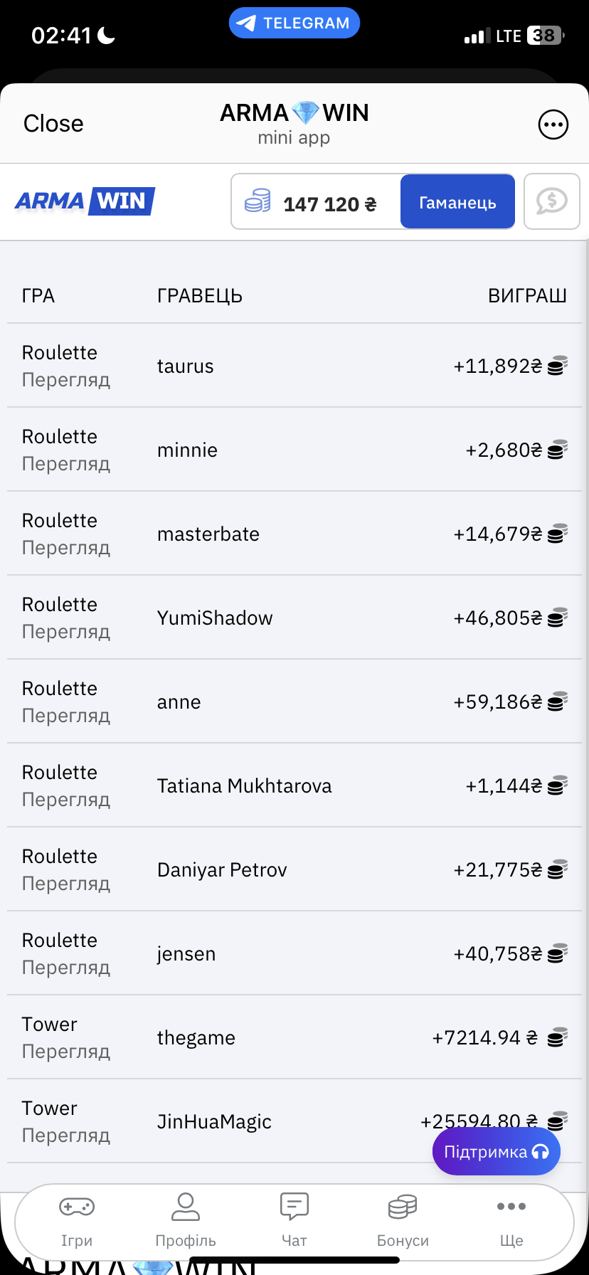 Based on the interface and visible features, ARMA WIN presents itself as a well-structured Telegram mini app designed for quick gaming sessions. The combination of multiple game formats, bonus features, and wallet integration makes the platform convenient to explore.