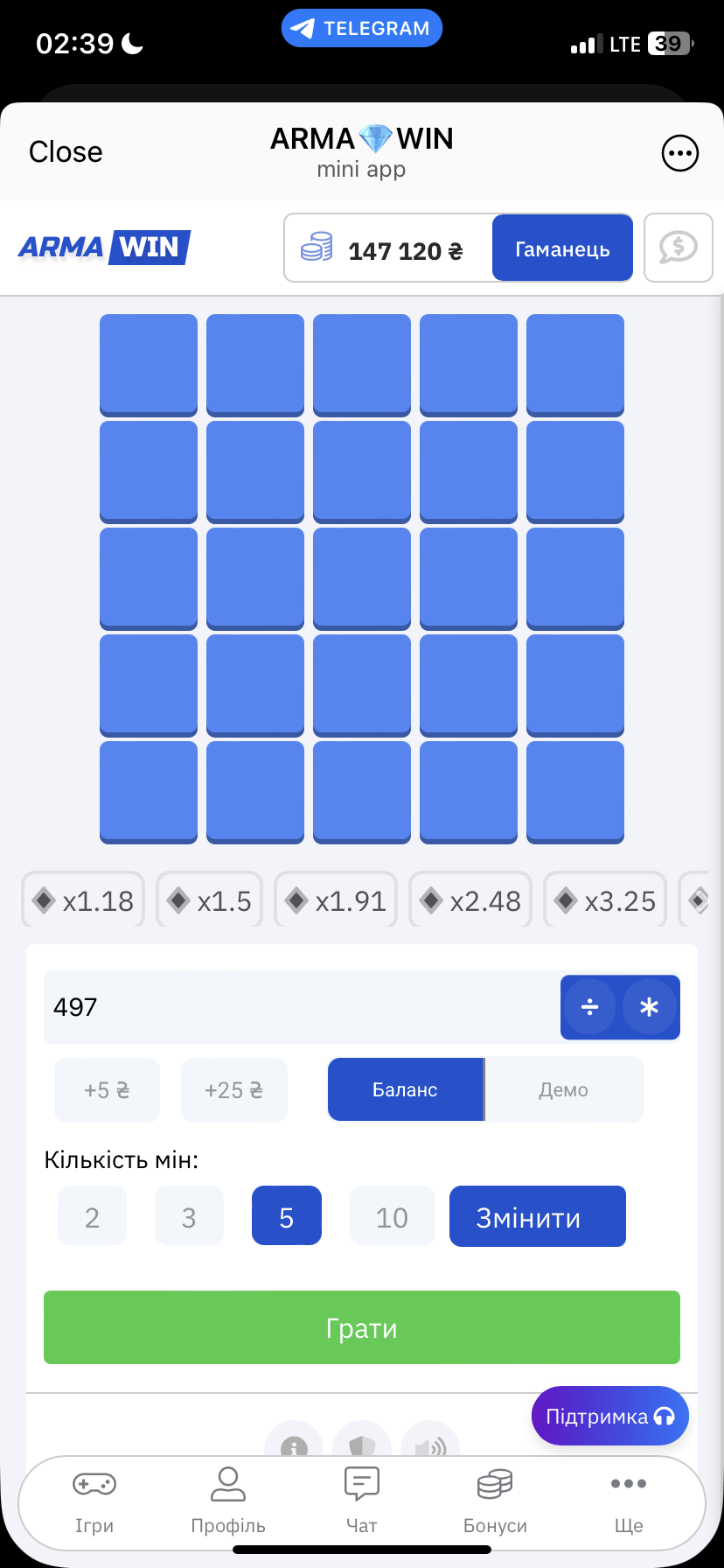 ARMA WIN is a Telegram-based gaming mini app that brings several popular chance-based mini games into one compact platform. Instead of downloading a standalone mobile app, users interact with the entire service directly within Telegram.